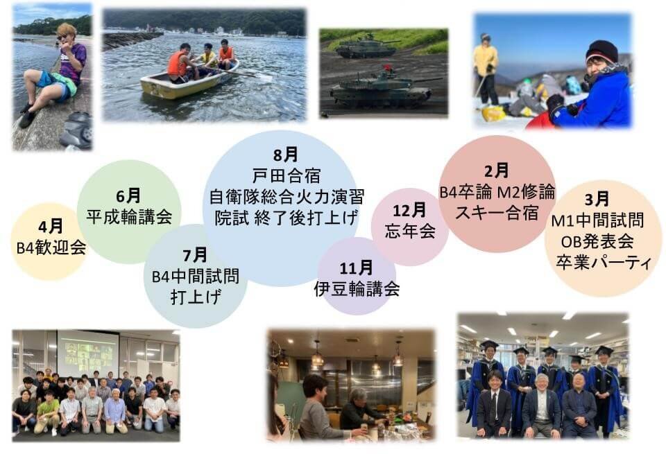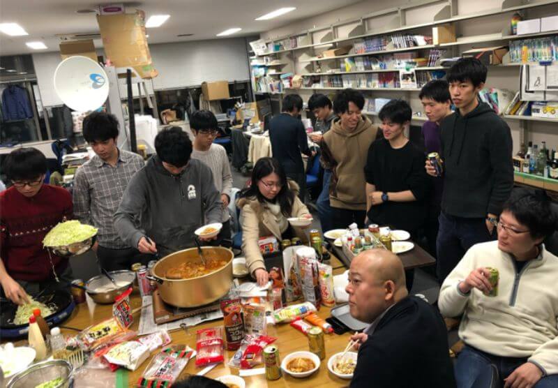 新B4M1歓迎会,院試終わり,卒論修論発表後,忘年会など節目ごとに居室内で打ち上げを行っています.学生主導で料理を作ったり,忘年会の時にはB3による少人数ゼミ発表を見たりその場で実演したりと賑やかでアットホームな雰囲気に包まれています.
