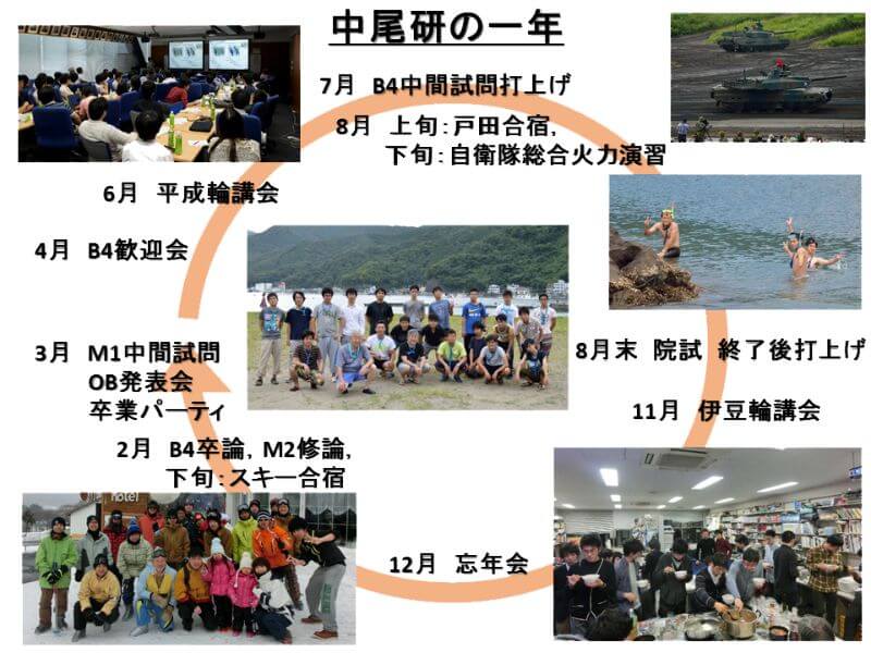 Students share information with their labmates who have a different topic from their own, which enable them to review/revise themselves from a new perspective. Students are stimulated by passionate discussions with delightful and unique professors. Students participate in frequently arranged field trips and lectures to broaden their knowledge. Students gain a wide range of knowledge from alumni who are active in various fields. The Nakao Laboratory provides an environment that fosters students who can set and solve problems on their own, and promises the rejoice to everyone’s research life.