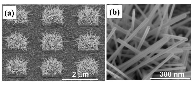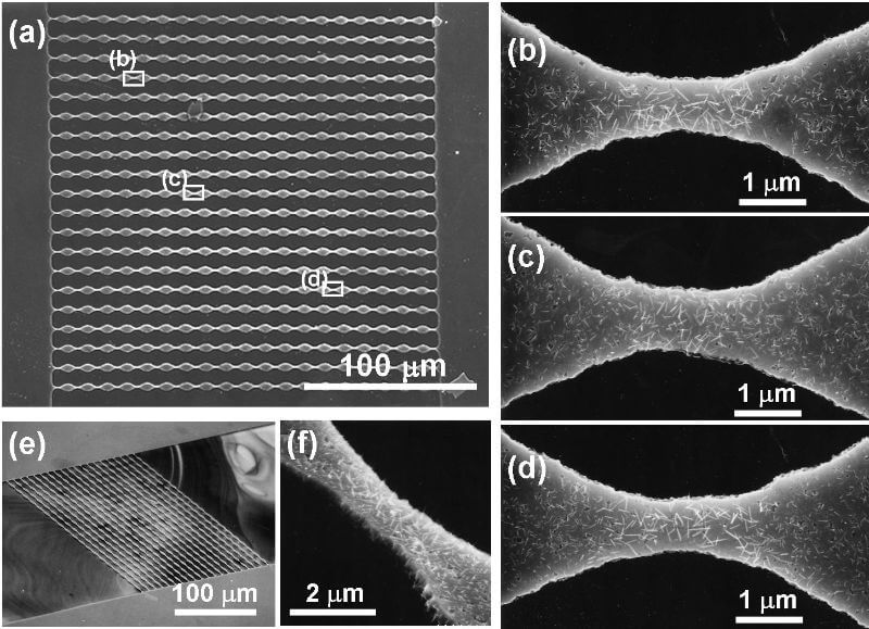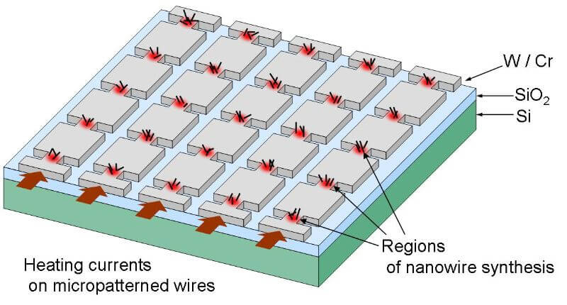 金属を,コントロールされた酸素雰囲気下で加熱すると,単結晶酸化金属ナノワイヤが生成される.酸化金属は材料によって異なるが,あるバンドギャップをもつことから,FET(電界効果トランジスタ)やガスセンサに応用できる可能性がある.また,先端がナノスケールで尖っていることからフィールドエミッション(電界放出)素子としても期待される.下図はタングステンのスパッタ膜を高温加熱することで生成した酸化タングステンナノワイヤ(W18O49)である.デバイス応用のために,タングステン薄膜のワイヤパターニングと通電加熱を組み合わせ,生成温度箇所を制御し,アレイ化したものである.このように局所生成技術はフィールドエミッション特性の向上や,デバイス製作場所制御などに有用である.