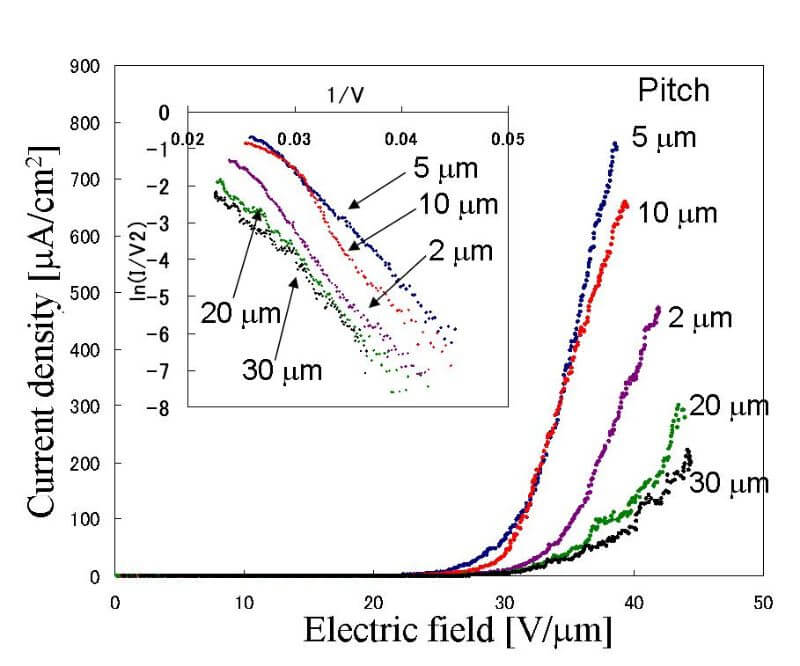 酸化タングステンナノワイヤのフィールドエミッション特性を向上させる方法としてナノワイヤを適度に分散させる方法がある.ナノワイヤの間隔が広がるとナノワイヤ先端に集中する電界が大きくなり,逆にナノワイヤの密度が高いと放出源が増え,単位面積当たりの電流密度が上がる.その効果を,タングステン薄膜をパターニングして作製した色々なピッチ(2/5/10/20/30)のアイランドに生成させフィールドエミッションさせ調べた.左図の□1μmのアイランドでは,ピッチ5μmの基板が最も電流密度が高いことがわかった.