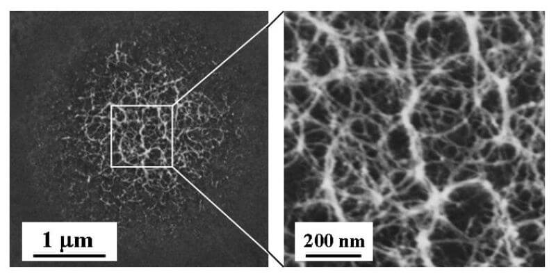 グラファイトを丸めた構造で,様々な電気特性を示すカーボンナノチューブは,ナノテクノロジー分野の中で最も数多く研究されている対象の一つである.それをナノデバイス生産に応用する技術の候補として,局所的に温度を高めその部分のみにカーボンナノチューブを生成させる技術を提案した.局所加熱させるためにレーザを用い,左図のようにレーザを効率的に基板表面に吸収させ熱に変換させるために「エネルギ吸収層」と称する層を形成し,直径約1μmの範囲にカーボンナノチューブを生成させることに成功した(右SEM像).また,ラマン分光により,これが電子デバイスに有用な単層カーボンナノチューブであることを確認している.