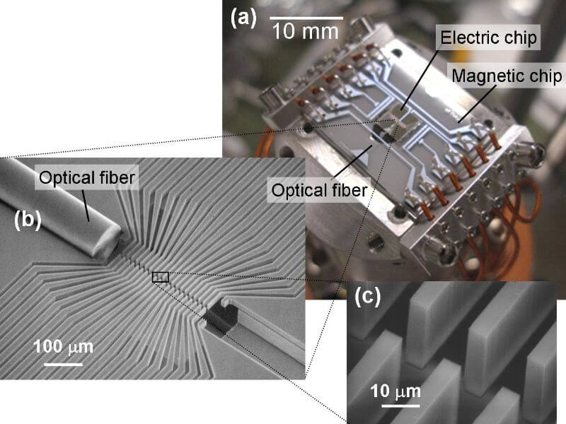 原子をレーザにより冷却する技術がある.物理工学科香取研究室との共同研究で,レーザ冷却された原子をチップ上でマニピュレーションし,量子情報処理を目指す研究を行っている.ナノ・マイクロ加工技術を用いてその電極を作製し,実際にトラップすることができた(左図).トラップサイトを複数有する電極や,チップ内で原子を輸送する電極を作製しその実験に挑戦している.
