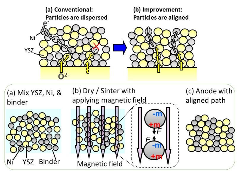 しかし,現状の燃料電池では,電極内の微細構造はランダムに構成されているためイオン・電子・ガスの物質輸送抵抗が大きく,理論効率には程遠い.燃料極において,酸化物イオン・電子・ガスはそれぞれYSZ(イットリア安定化ジルコニア)・Ni・空隙内を輸送され,その三相界面(TPB: Triple-Phase Boundary)において化学反応が起きる.本研究では,Ni粒子を磁場を用いて配列させることで,三相の屈曲率(物質の輸送しにくさの指標)を下げることを提案する.このことで,活性TPB率も向上させることができた.