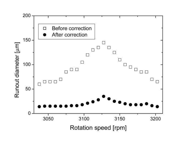 これまでは,ナノ加工技術,ナノ材料生成に関する研究を紹介したが,回転体の偏芯補正に関する研究も行っている.ハードディスクやポリゴンミラーなど高速回転する回転体は,高精度に偏芯(アンバランス)を補正する必要がある.その生産ラインで用いることを想定し,瞬時に補正・固定する方法として,共振周波数を超えて,流路内の光硬化樹脂がアンバランスの逆位相に位置したときにUVを照射して硬化させる.実際に実証実験装置を用いて元のアンバランスの20%に補正した.