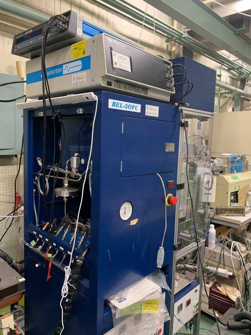 マイクロトラックベル製SOFC単セル性能・劣化評価装置BEL-SOFC(マスフローコントローラー内蔵), Potentio/Galvanostat(東陽テクニカ製Solartron SI 1287), Frequency analyzer(東陽テクニカ製Solartron 1255B),セル, 制御用PCから成ります. 順にガスの供給・流量制御, 電流・電圧の印加・取得, 印加信号送信, 発電, 条件の指示を行います.
