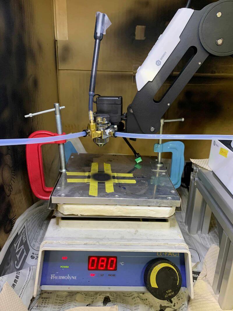PEFCの触媒層塗布に用いています. ノズルの開閉は電磁弁により行っており, 任意のタイミングで塗布を行うことができます. またノズルはロボットアームの先端に固定し, 指定の経路で塗布できます.