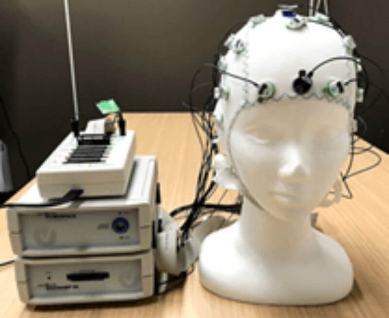 脳波計測用のアンプ(左)とノイズに強いアクティブ電極を用いた脳波キャップ(右)です.非侵襲かつ高時間分解能で脳活動を計測することが可能です.中尾研では,運転中のヘッドアップディスプレイ視認時の脳内負荷の評価,ユーザエクスペリエンス,創造性,痛み認知に関する研究開発で使用しています.