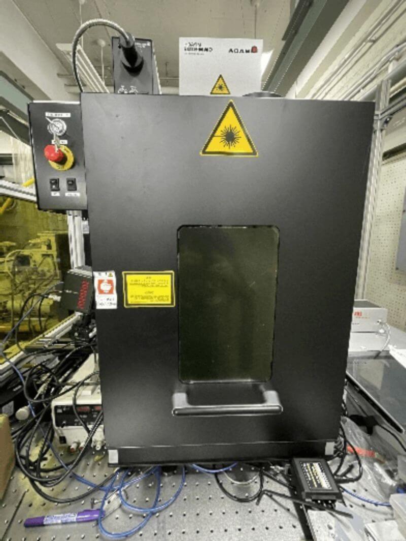 最大出力500Wのシングルモードファイバーレーザ溶接機.加工BOX上部のガルバノスキャナーでレーザを走査します.中尾研では金属3Dプリンターの研究や金属接合の研究で使用しています.
