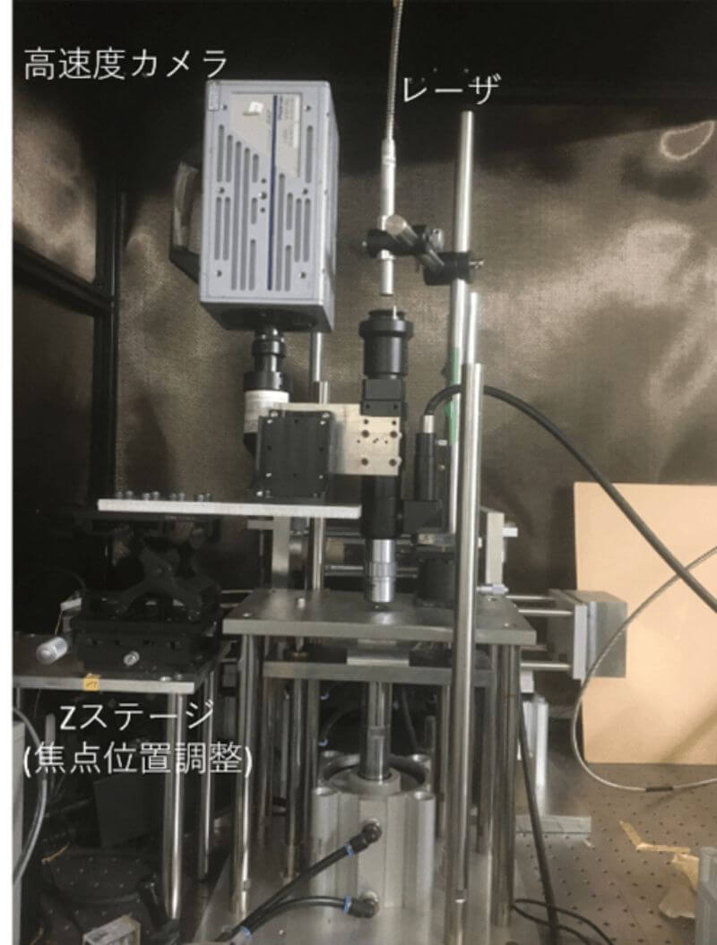 ガラス転移温度以上に加熱した熱可塑性樹脂に金型をプレスしてナノ形状を付与する熱ナノインプリント技術の応用として,当研究室ではレーザを熱源にしたレーザアシストナノインプリント技術を研究しています.学生により作製された本装置は,加工中のレーザの反射光を高速度カメラで撮影することで樹脂の充填現象を観察することを目的に使われています.