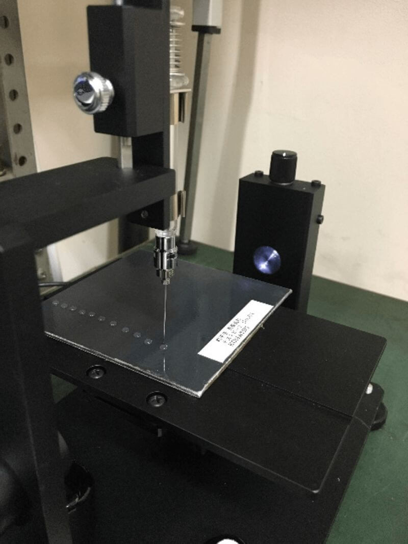 濡れ性(固体表面に対する液体の付着のしやすさ)の評価を行う装置です.試料表面に滴下した液滴を撮影し,画像処理から接触角を測定する機能を有します.中尾研では主にナノ・マイクロ加工を施した試料表面の評価に使われています.