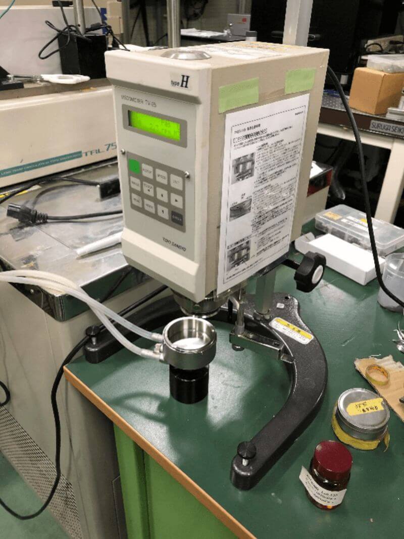 評価対象の液体に触れたロータを回転させてトルクを測定することで,液体の粘度を測るコーンロータ型の粘度計です.中尾研では,様々な材料から調製したペースト類の特性を評価するために使われています.