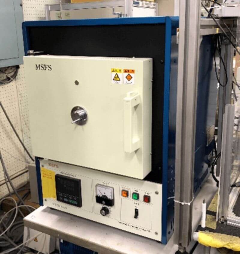 内部に取り付けられた炭化ケイ素製の発熱体に電流を流して加熱するマッフル炉と呼ばれる炉です.この炉は最高1500℃までの加熱が可能で,セラミックスの焼成などの高温プロセスに使用されています.温度コントローラが備わっており,温度履歴を指定して加熱を実行することもできます.